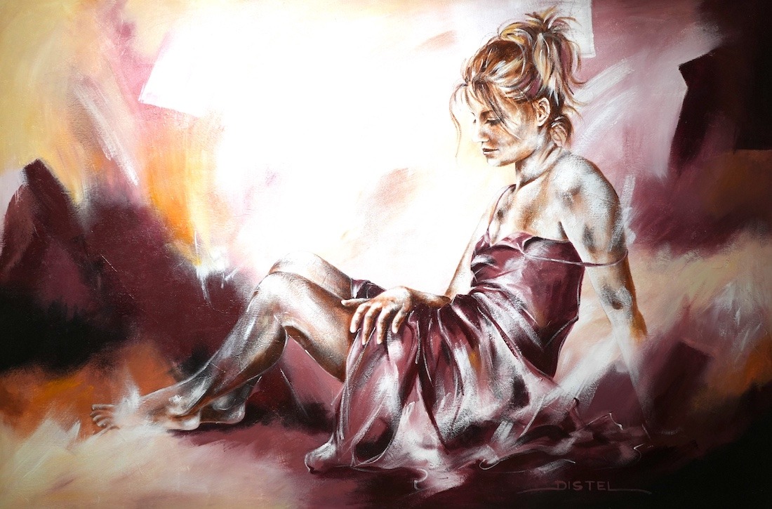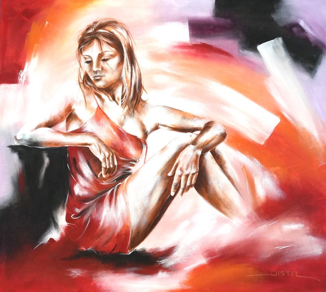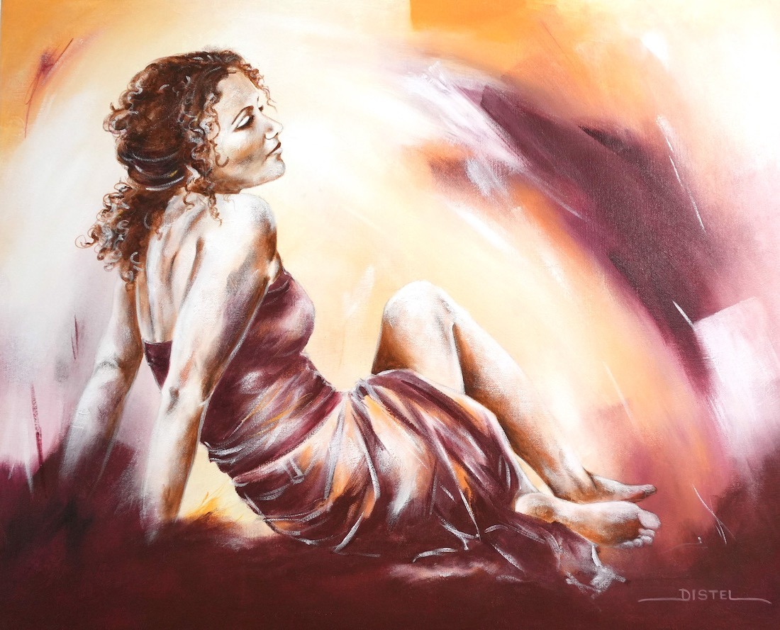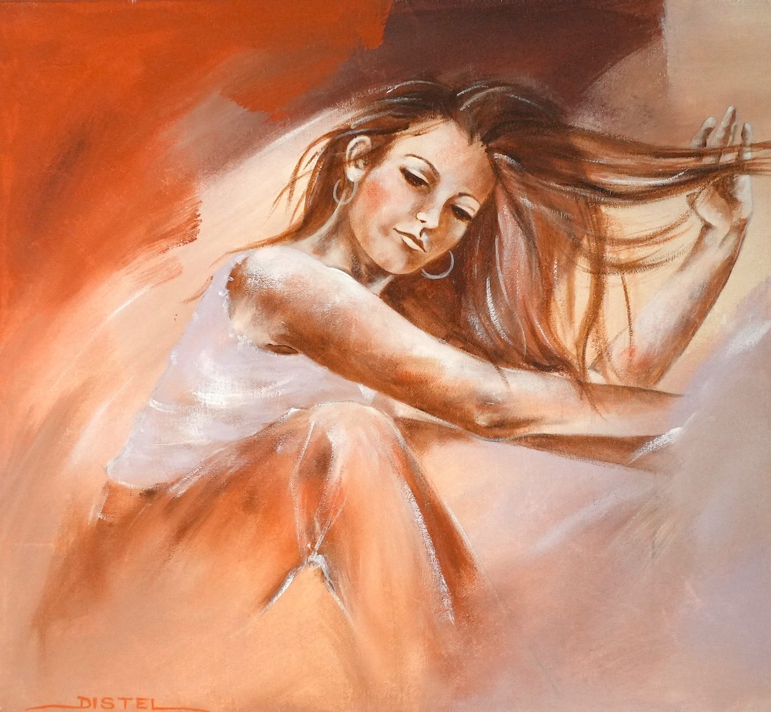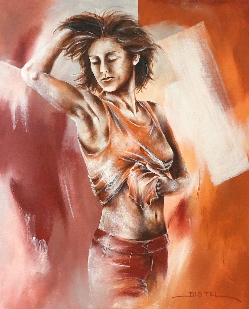 Distel’s paintings are characterized by powerful lines that depict young women, capturing both their strength and vulnerability with meticulous precision. Through fluid movements, admirable flexibility, and suggestive poses, her work conveys a sense of mystical pride. A bare back or a glimpse of a torso exemplifies a proud woman, always portrayed with a certain restraint. In her art, beauty and harmony intertwine with feminine sensuality, presenting honest and natural emotion. The chosen color tones bring warmth and harmony to her figurative art.