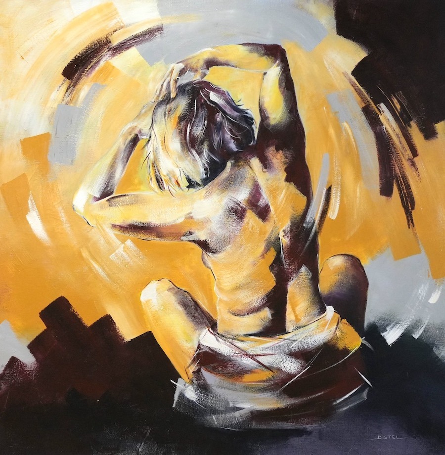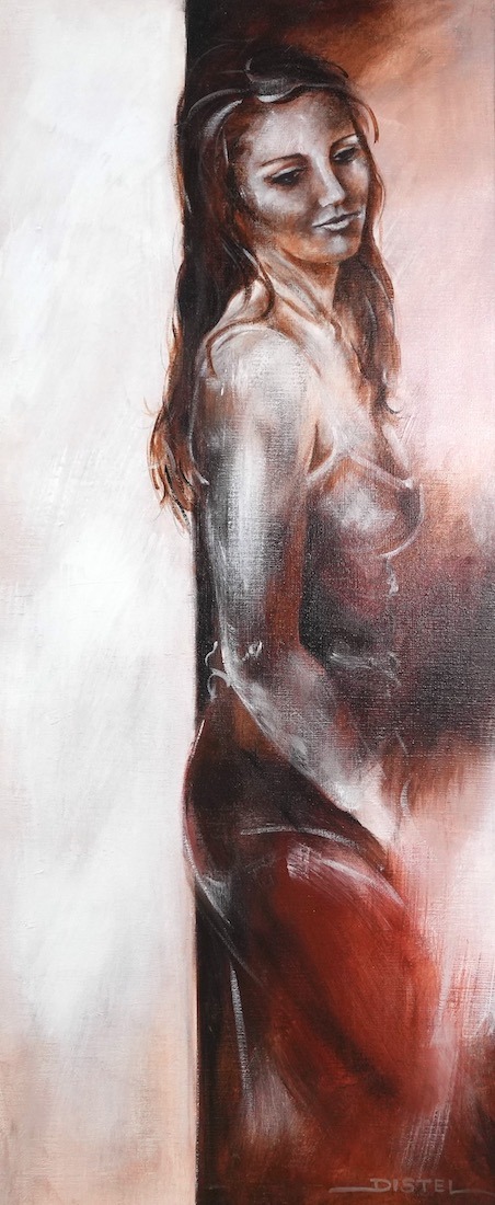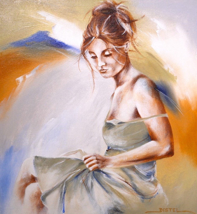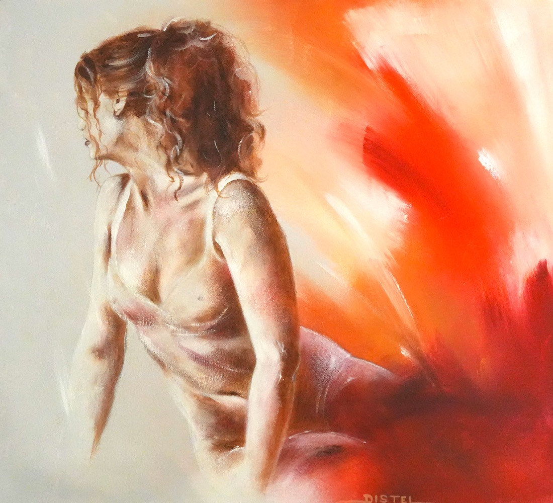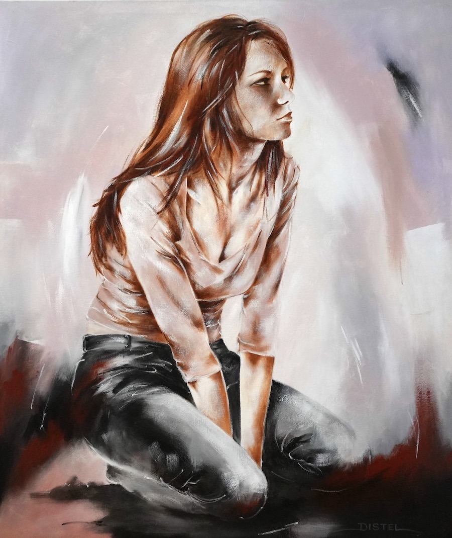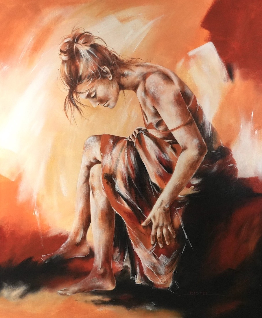 Distel’s paintings are characterized by powerful lines that depict young women, capturing both their strength and vulnerability with meticulous precision. Through fluid movements, admirable flexibility, and suggestive poses, her work conveys a sense of mystical pride. A bare back or a glimpse of a torso exemplifies a proud woman, always portrayed with a certain restraint. In her art, beauty and harmony intertwine with feminine sensuality, presenting honest and natural emotion. The chosen color tones bring warmth and harmony to her figurative art.