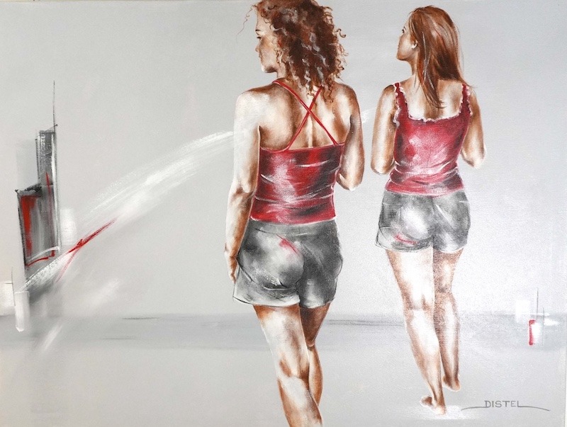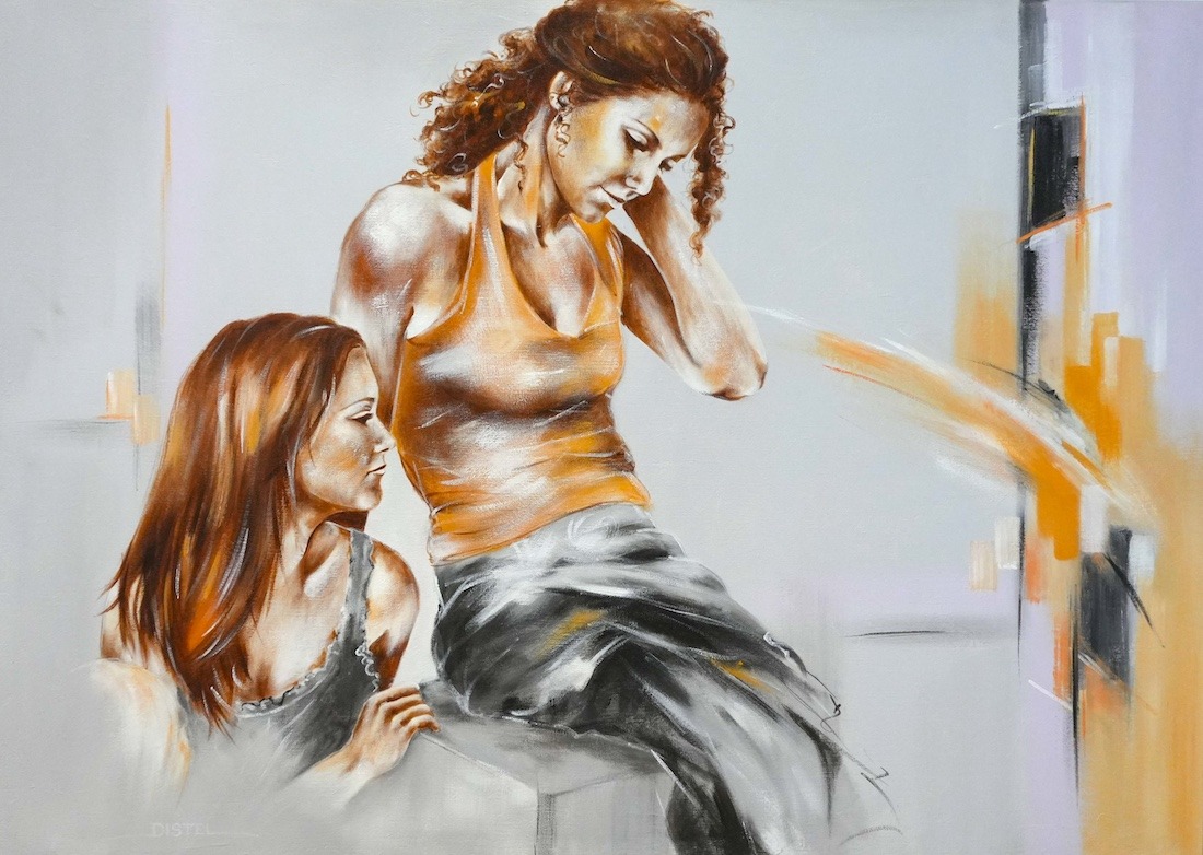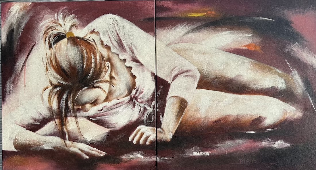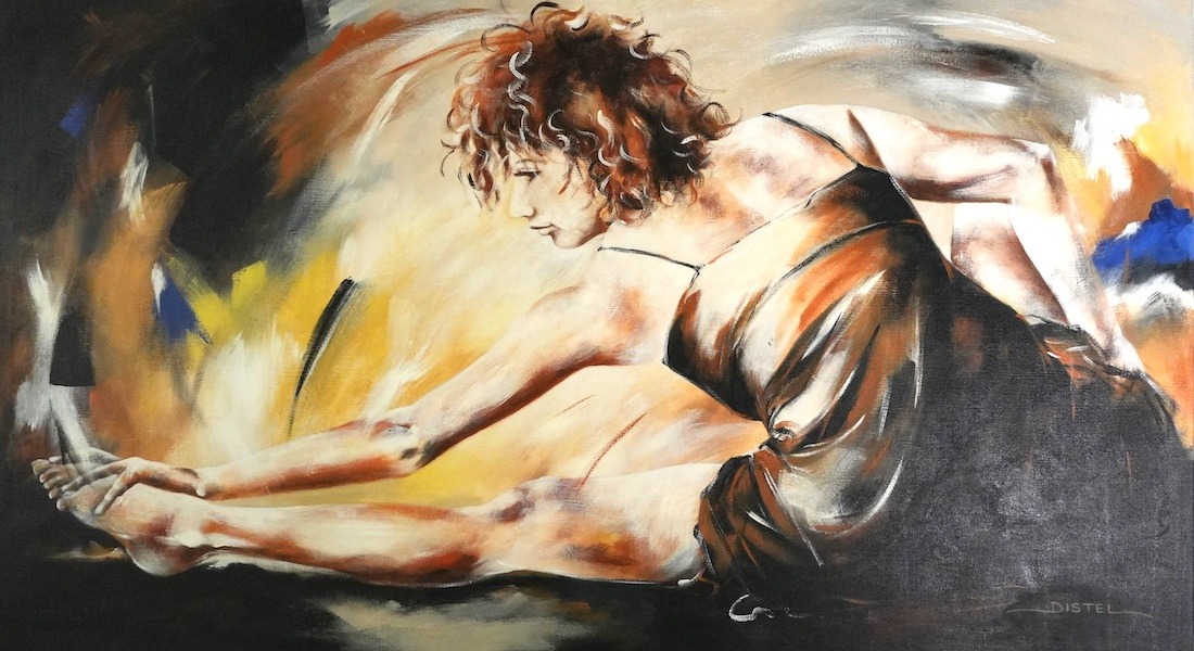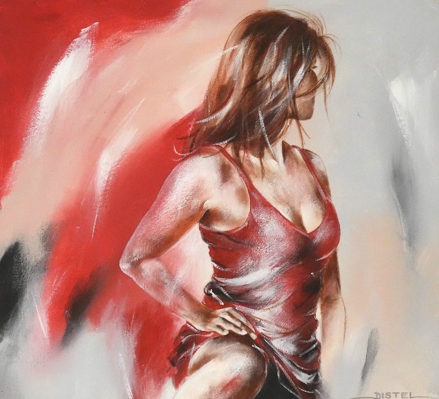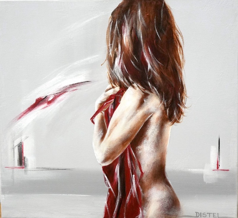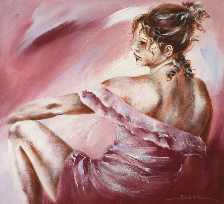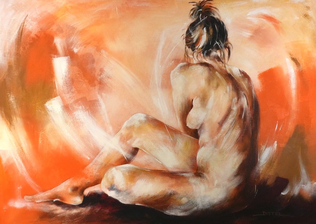 Distel’s paintings are characterized by powerful lines that depict young women, capturing both their strength and vulnerability with meticulous precision. Through fluid movements, admirable flexibility, and suggestive poses, her work conveys a sense of mystical pride. A bare back or a glimpse of a torso exemplifies a proud woman, always portrayed with a certain restraint. In her art, beauty and harmony intertwine with feminine sensuality, presenting honest and natural emotion. The chosen color tones bring warmth and harmony to her figurative art.