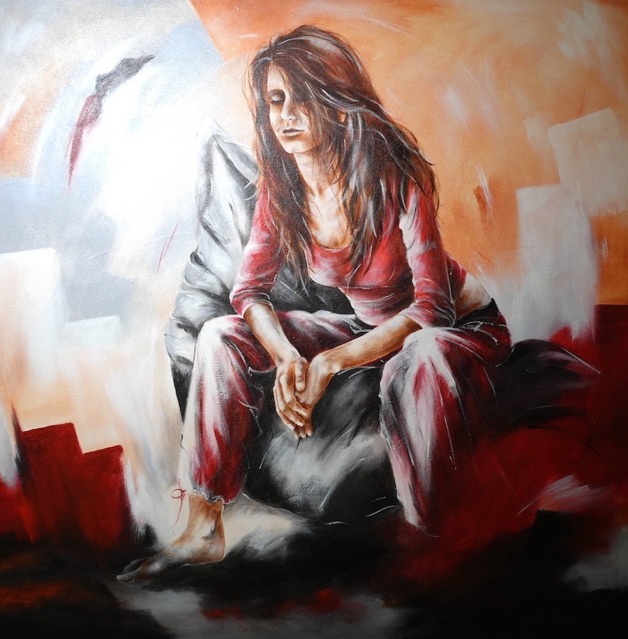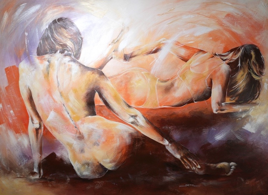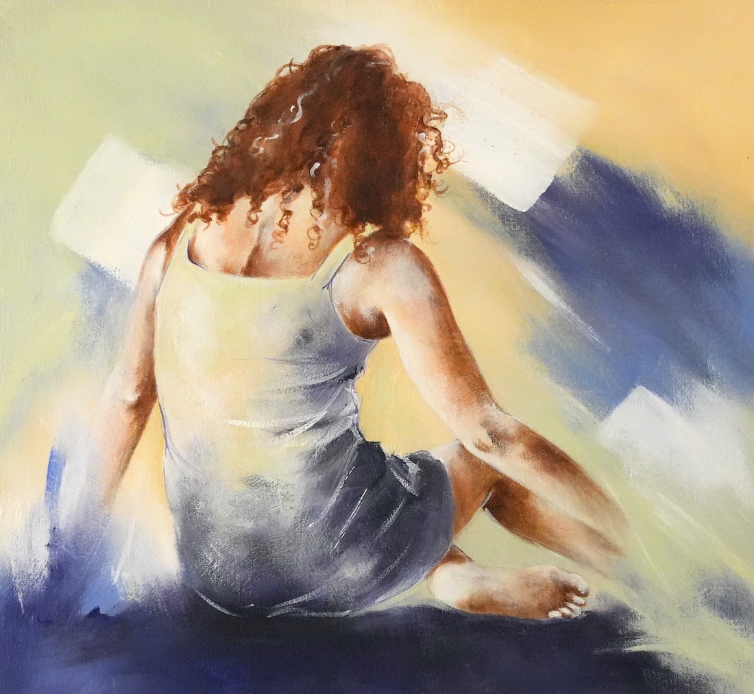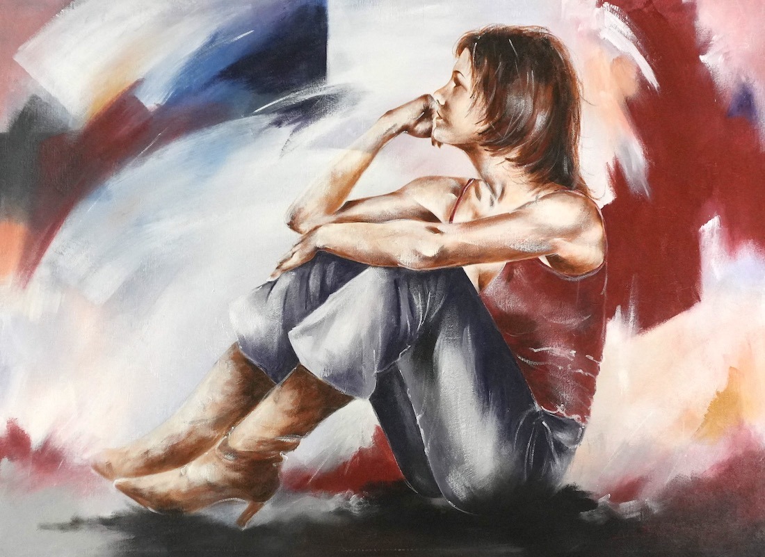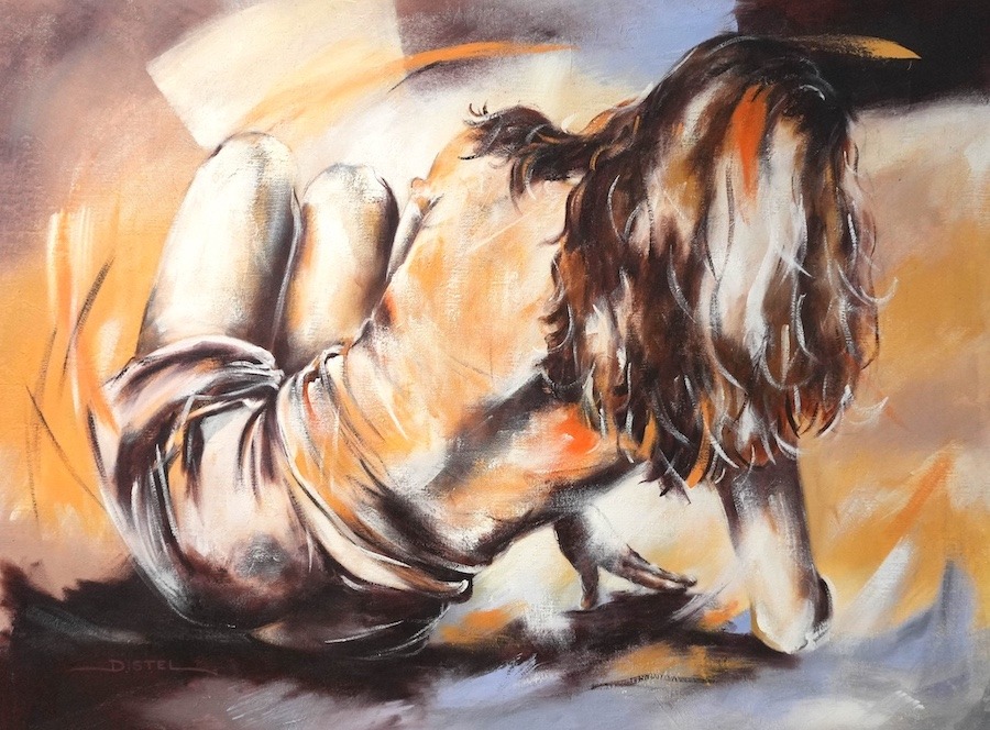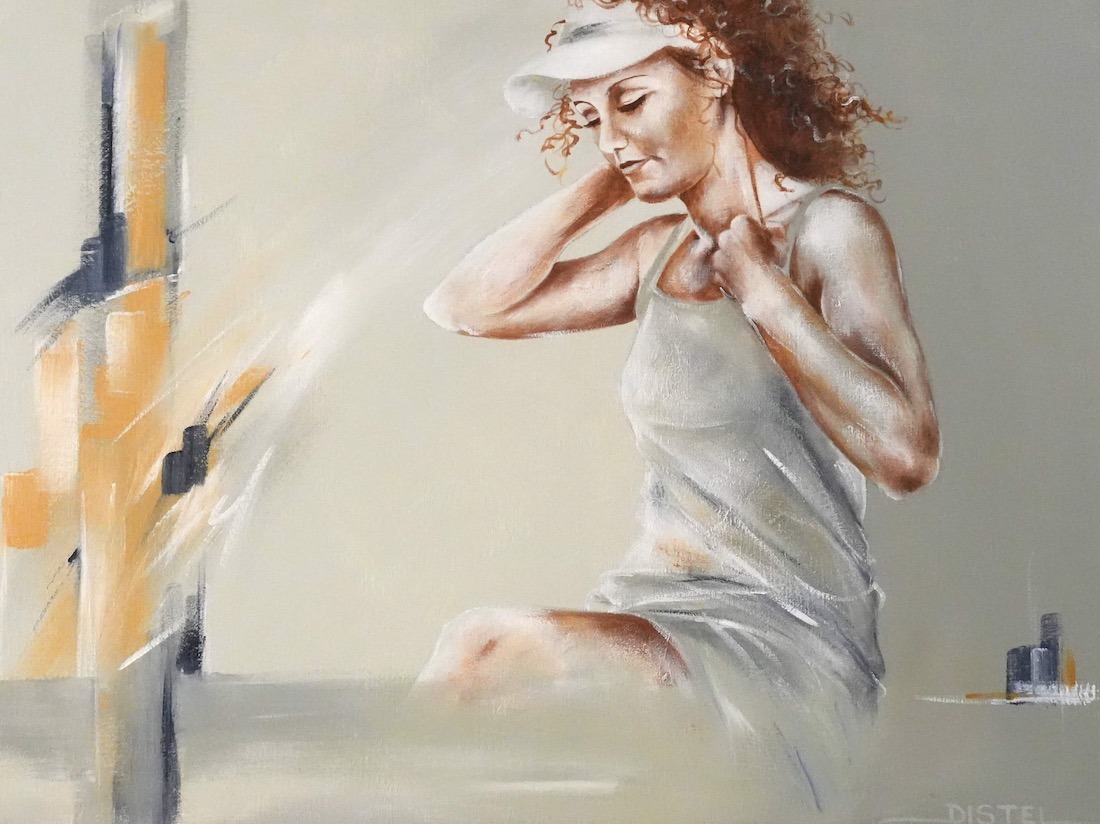 Distel’s paintings are characterized by powerful lines that depict young women, capturing both their strength and vulnerability with meticulous precision. Through fluid movements, admirable flexibility, and suggestive poses, her work conveys a sense of mystical pride. A bare back or a glimpse of a torso exemplifies a proud woman, always portrayed with a certain restraint. In her art, beauty and harmony intertwine with feminine sensuality, presenting honest and natural emotion. The chosen color tones bring warmth and harmony to her figurative art.